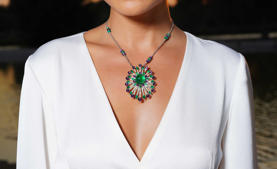 At its heart lies a cabochon emerald of 34.80 carats, a gem of mesmerizing intensity and unparalleled beauty. Encircled by a radiant halo of amethyst, emeralds, and diamonds, this pendant reflects life’s quiet grandeur and enduring mystery—an eternal homage to nature’s poetry. The chromatic interplay between the vivid emerald and the lush purple of the amethysts creates a visual symphony, resonating in total harmony.