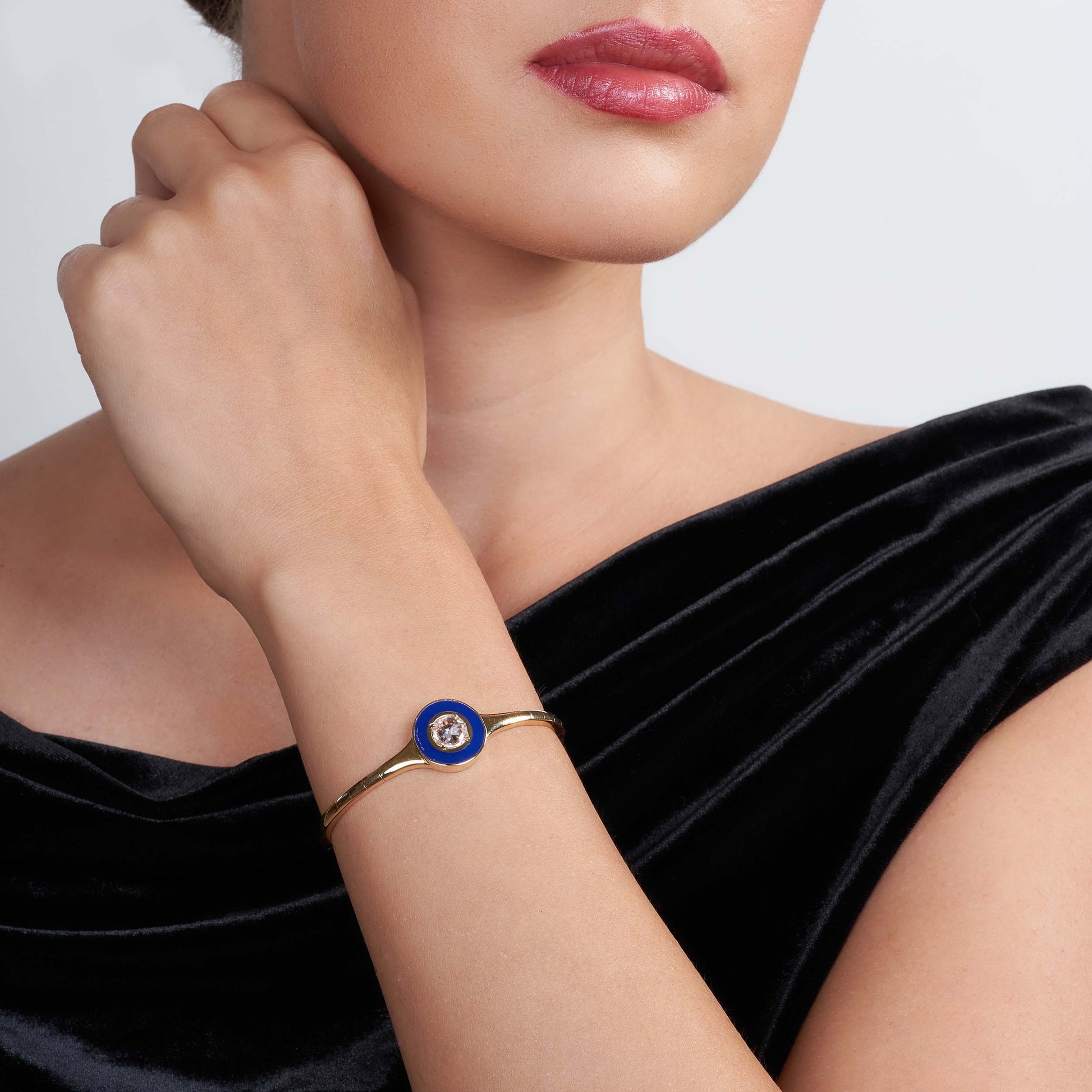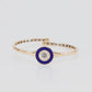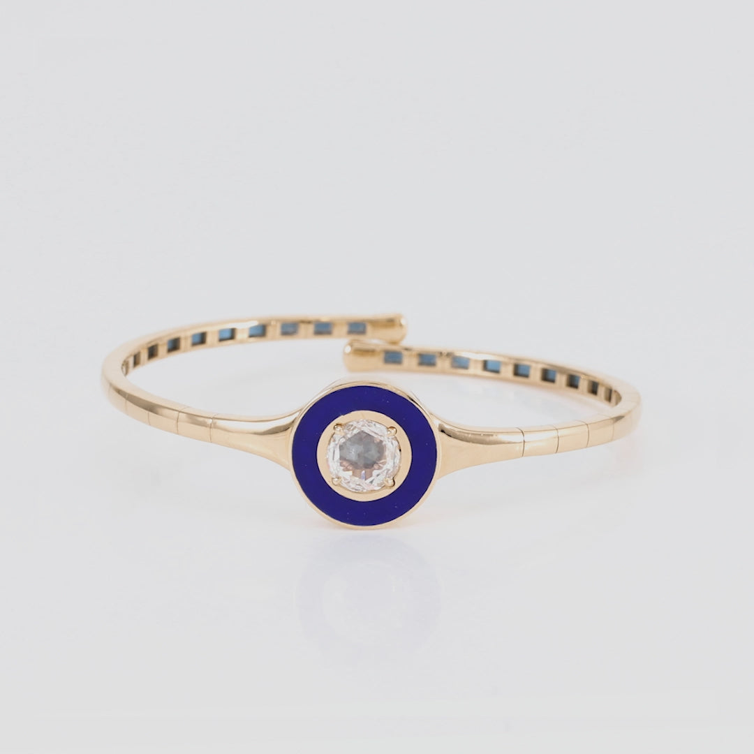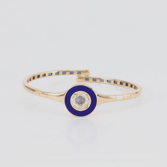 An elegant bangle set with a diamond in the center framed with a beautiful contrast of enamel, finished in yellow gold.