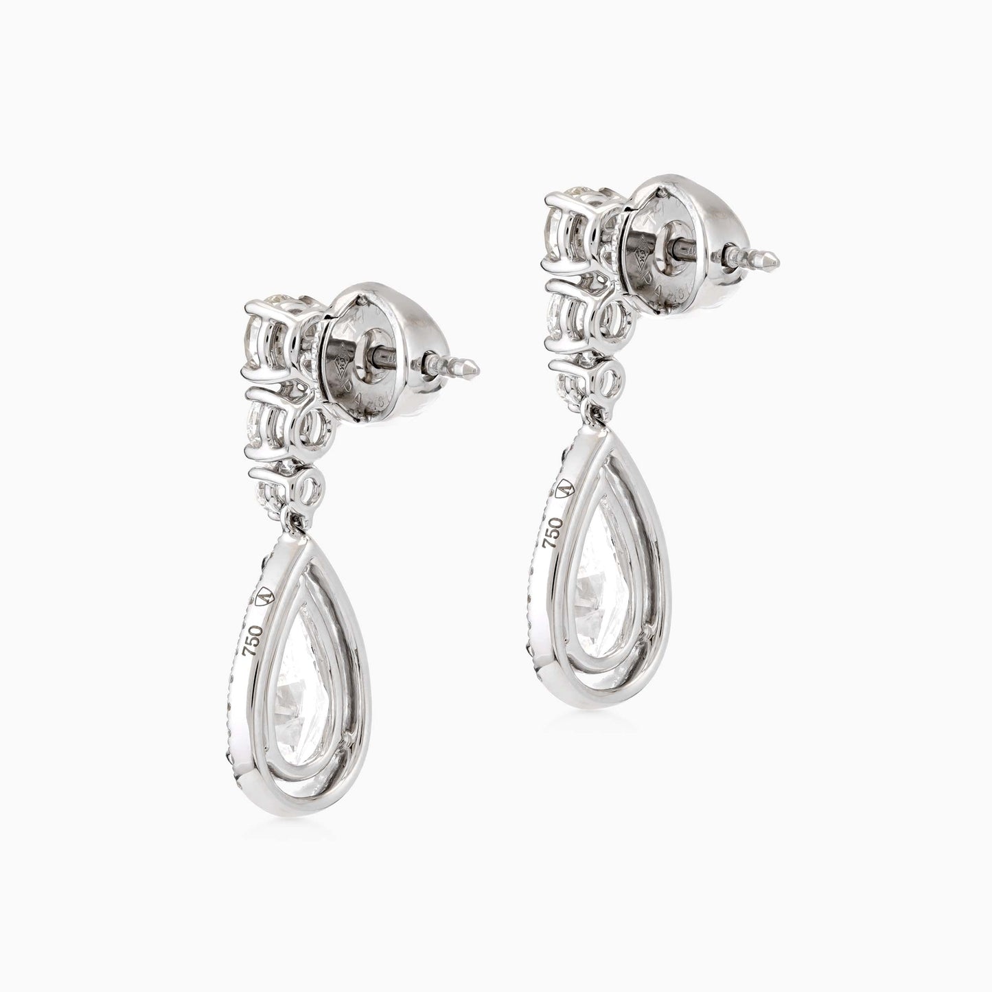Suspended from graceful graduating diamonds, a perfect couple of pear shaped diamonds of exceptional quality weighing 3.02 carats elegantly crafted in white gold.