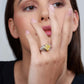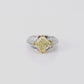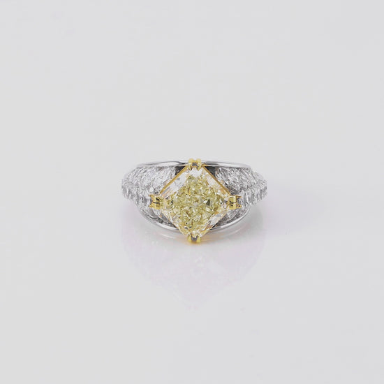 A radiant cut yellow diamond ring enhanced with marquise diamonds on both sides finished in white gold.