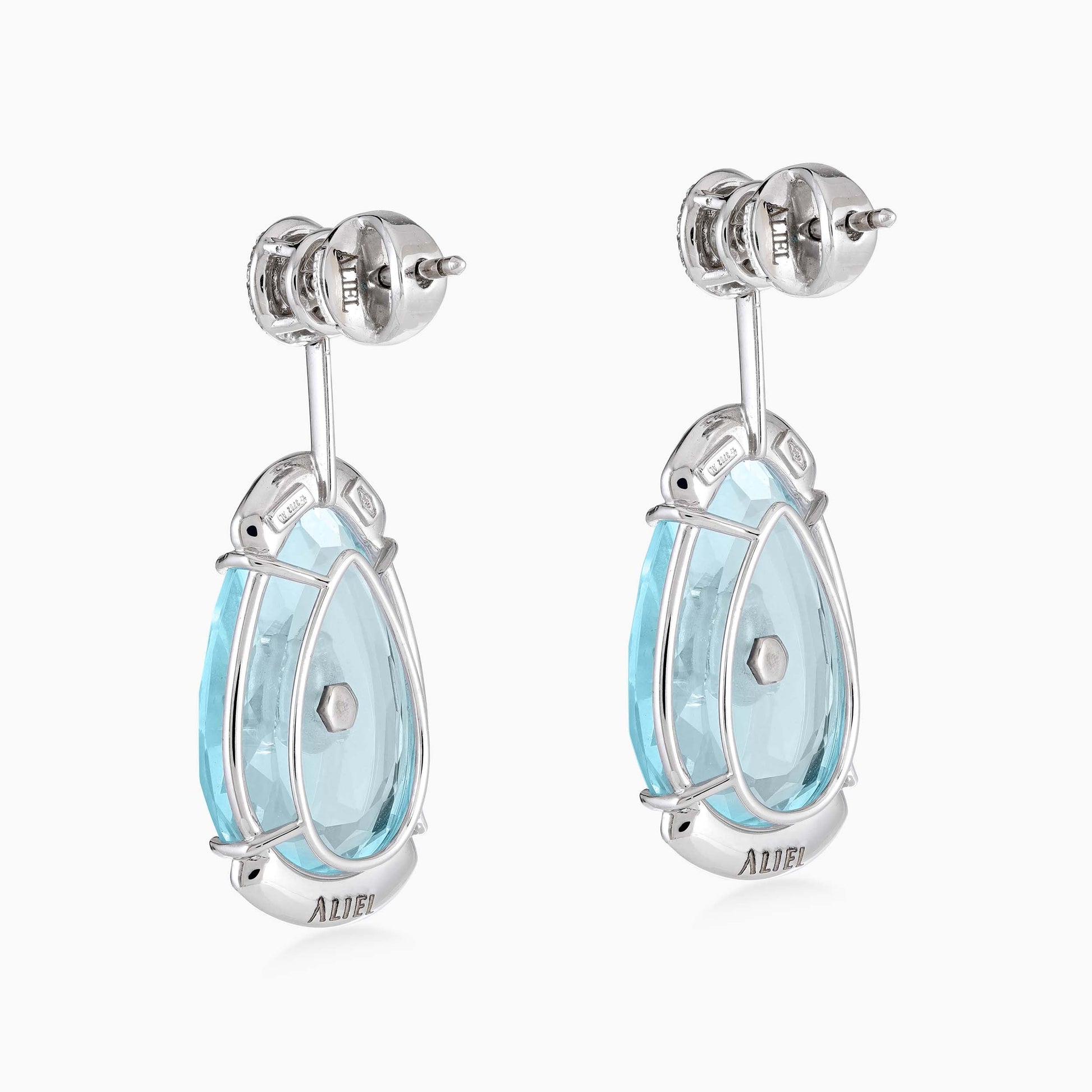 A stunning duo of pear-shaped diamonds set in a pair of aquamarines, totalling over 21 carats, delicately suspended from loops adorned with pavé diamonds.