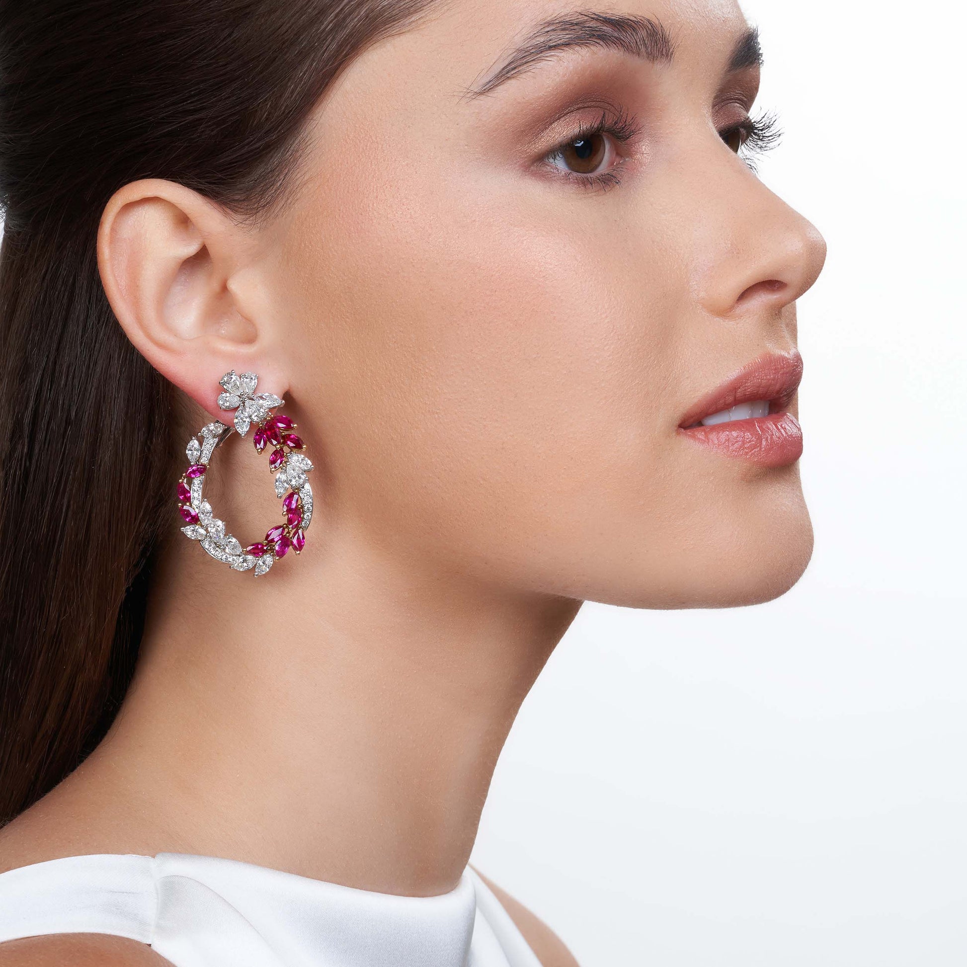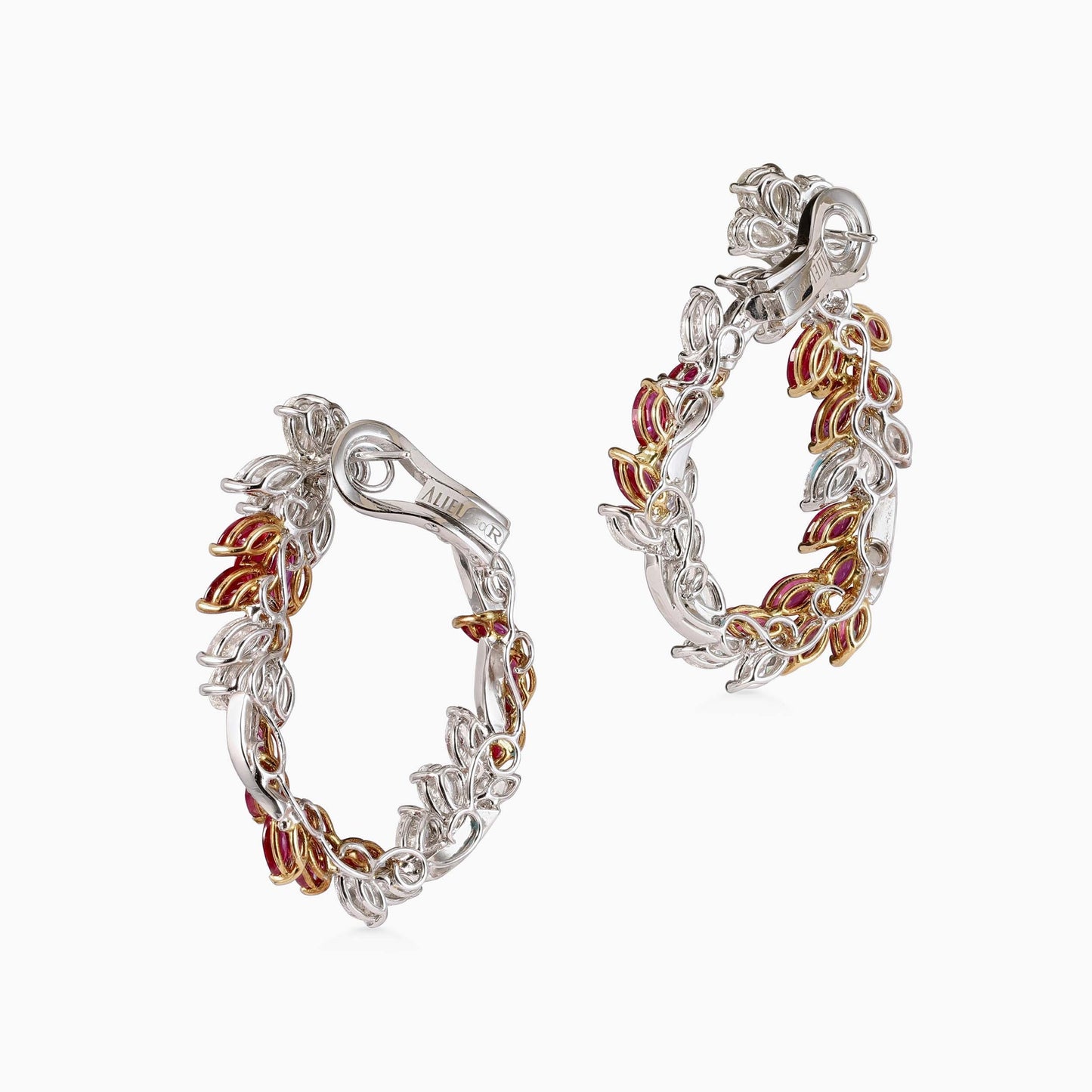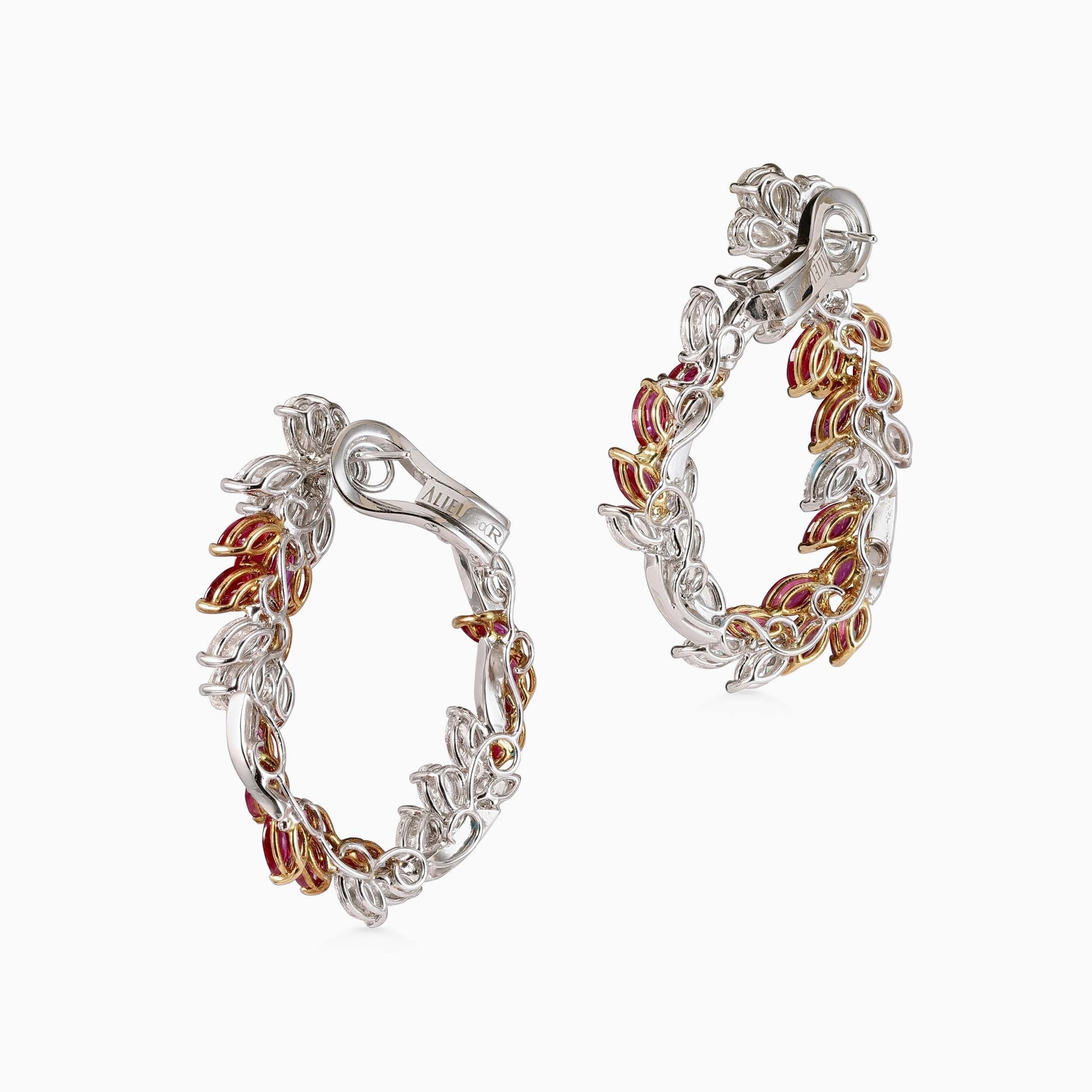 An alluring pair of spiral hoop shaped earrings, designed with a combination of Burmese rubies and white diamonds set in white gold.