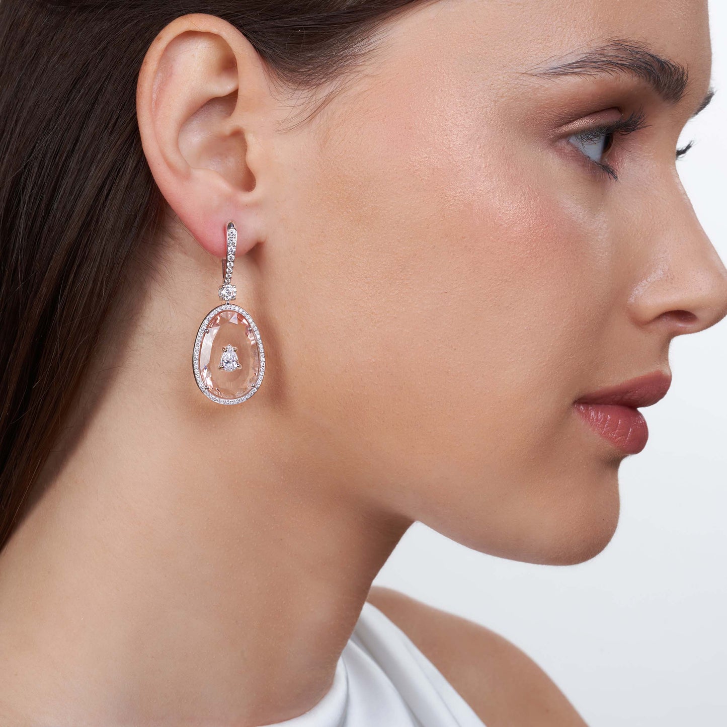 A perfect pair of pear-shaped diamonds nestled within morganites weighing over 19 carats, gracefully descending from loops of white gold adorned with pavé diamonds.