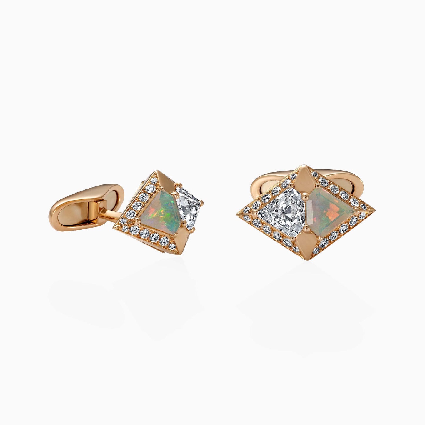 These exquisite cufflinks feature a stunning pair of kite-shaped diamonds elegantly set alongside perfectly matched opals, all crafted in rose gold.