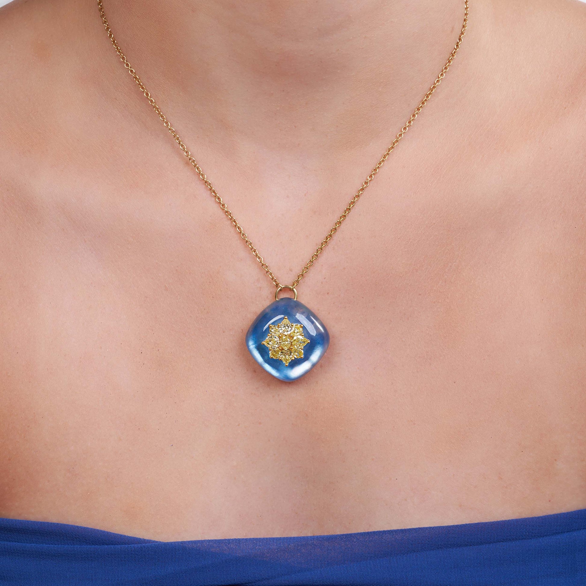 A topaz and mother of pearl doublet set with Fancy Yellow diamonds in the center that create a beautiful contrast of colours finished in yellow gold.