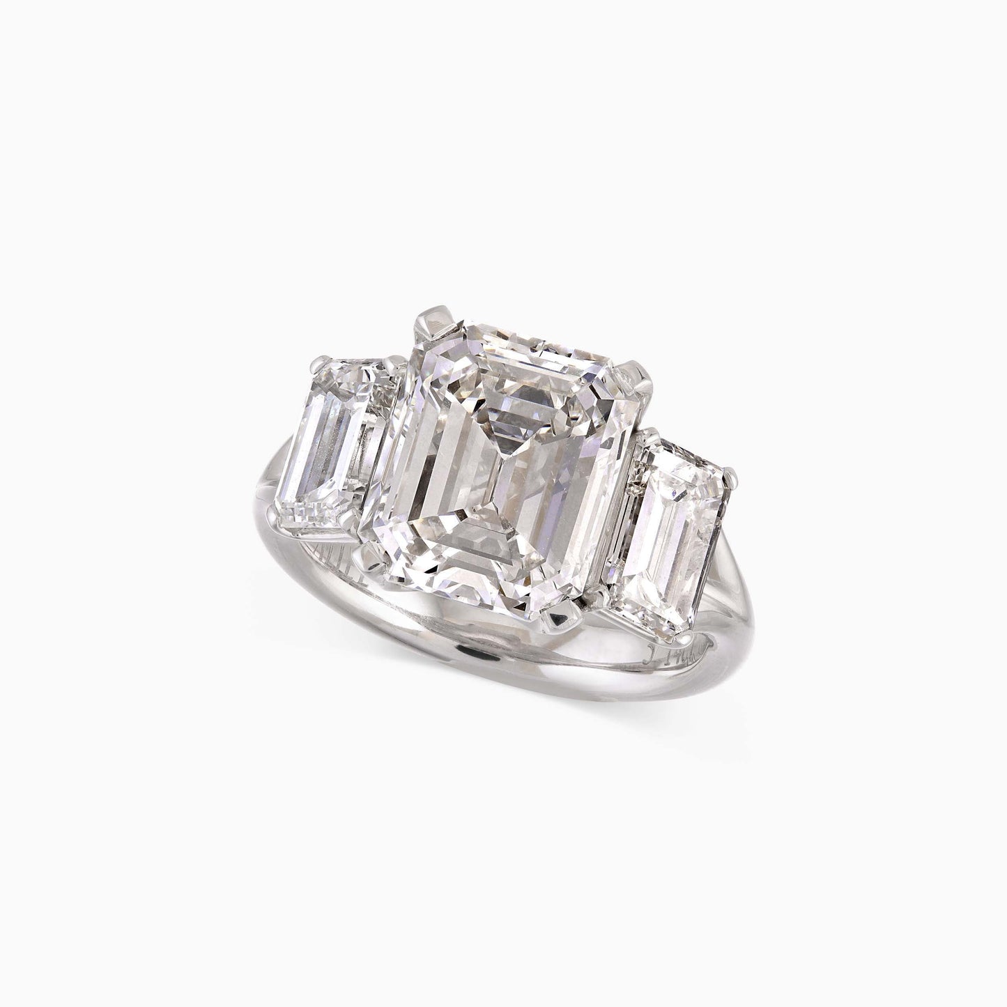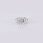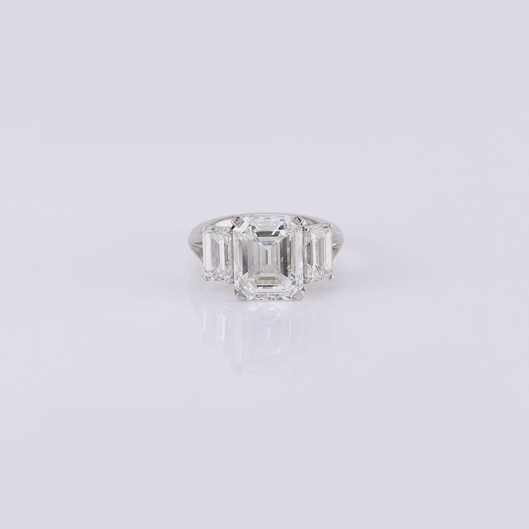 Exquisitely positioned at the centre of the ring lies an emerald-cut diamond, shouldered by complementing emerald-cut diamonds on both sides, all set in white gold.