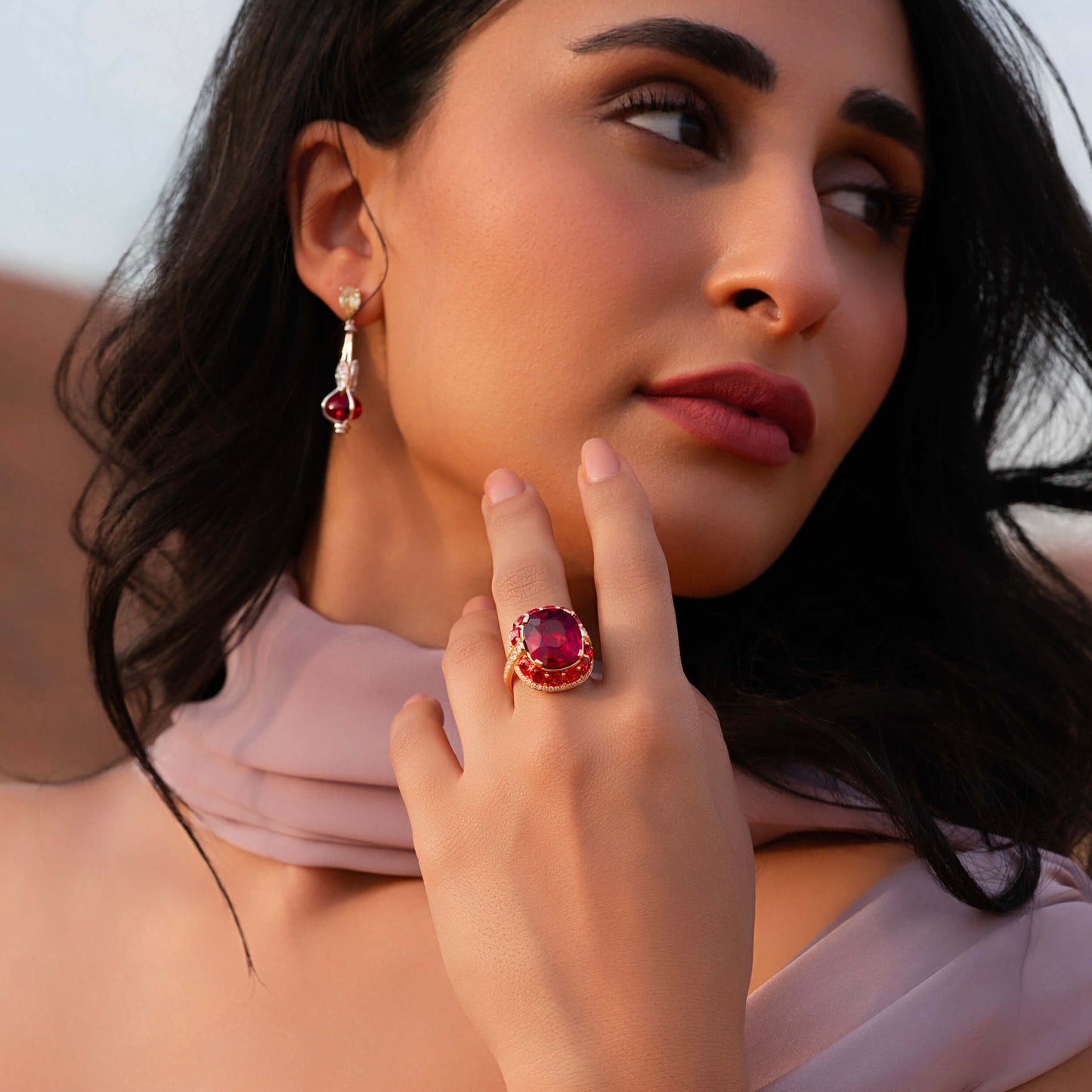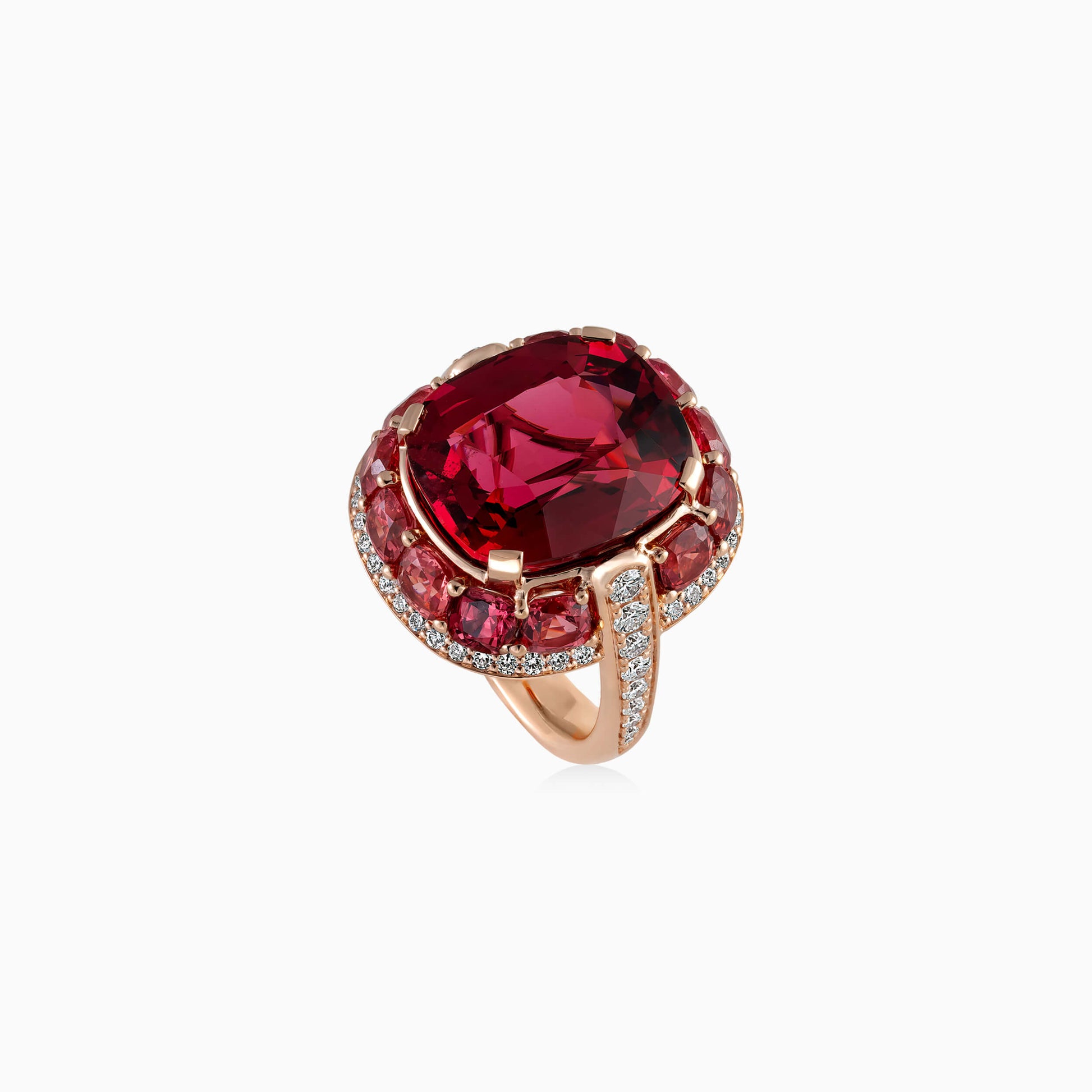 Set majestically at the center, a Tanzanian spinel of over 12 carats, encircled by spinels and diamonds, masterfully crafted in rose gold.